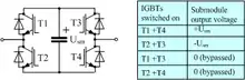 Another alternative replaces the half bridge MMC submodule described above, with a full bridge submodule containing four IGBTs in an H bridge arrangement, instead of two.[41] The full-bridge variant of MMC allows the submodule capacitor to be inserted into the circuit in either polarity. This confers additional flexibility in controlling the converter and allows the converter to block the fault current which arises from a short-circuit between the positive and negative DC terminals (something which is impossible with any of the preceding types of VSC). Furthermore, it allows the DC voltage to be of either polarity (like a LCC HVDC scheme), giving rise to the possibility of hybrid LCC and VSC HVDC systems. However, the full-bridge arrangement requires twice as many IGBTs and has higher power losses than the equivalent half-bridge arrangement.