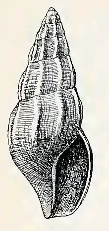 (Original description) The shell is white. The protoconch contains two smooth whorls. The other whorls are moderately rounded, with closely appressed summits marked by weak, depressed, rather broad, slightly protractive axial ribs, of which 10 occur upon the first three whorls, 12 upon the fourth and penultimate. One of the ribs is decidedly thicker, forming a strong varix. This feature is common to all of our specimens. The intercostal spaces about twice as wide as the ribs and very shallow. In addition to the axial sculpture the entire surface of the spire and the base is marked by equal and almost equally spaced, closely placed, wavy, incised, spiral lines, of which about 24 occur between the sutures on the penultimate turn and about 30 upon the base of the body whorl. The sutures are ill-defined. The aperture has an acute posterior angle. The outer lip is thick within, sharp at the edge. The sinus is scarcely indicated a little distance anterior to the summit. The columella is almost straight, covered by a thin callus, which extends up on the parietal wall, forming a tubercle near the posterior angle.[2]