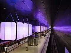 The station was designed by Munich-based architecture firm Raupach Architekten.[1] The design makes reference to the changing colors typical to the HafenCity, caused by reflections throughout the day by the wharf buildings' red brick and the ship hulls' iron and steel.