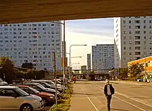 Hagalund (ⓘ) is a residential area and railway yard in Solna Municipality, 5 km north of central Stockholm. It is known for the blue highrise buildings "Blåkulla" (Blue Hill or Blockula) which, against a rather strong and long-lasting opinion, in the beginning of the 1970s replaced a picturesque working-class and craftsman neighbourhood built in the 1890s and portrayed by artist Olle Olsson Hagalund. There are still about half a dozen old houses preserved, a minor area called Gamla Hagalund (Old Hagalund) in the eastern part of the area.