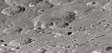 Hagecius is a lunar impact crater in the southeastern part of the Moon's near side. It was named after 16th century Czech naturalist Tadeáš Hájek (Latinized as Thaddaeus Hagecius).[1] This crater forms a triangular formation with the craters Rosenberger to the north-northwest and Nearch to the west-northwest. Like both of these craters, Hagecius has undergone erosion from subsequent impacts, and its outer rim is worn and irregular. The southeastern rim in particular is overlaid by three smaller craters designated Hagecius C, B, and G.