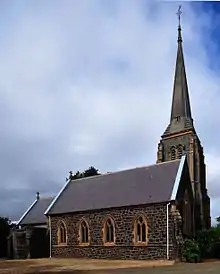 The church used bricks from a demolished brewery, possibly in Longford, and it was completed at a cost of approximately 950 pounds.[58] The building was designed by Harry Conway, a Launceston architect.[59] It is a largely brick building with freestone corbels and copings, and is of a Gothic Revival architectural style. The church is 40 by 25 feet (12.2 by 7.6 m) with a 12-by-10-foot (3.7 by 3.0 m) vestry, and was intended to seat 250 people.[58] By 1973 the Presbyterian congregation at Hagley was very small and there was cause for concern about its future.[60] The Presbyterian church building is still in the town, opposite the original Hagley hotel, but is now privately owned and no longer used for worship.[13]
