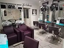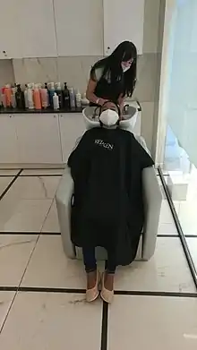 Hairdressers use specialized basins to perform a hair wash; these can be either forward or backward style. In the backward version (the more common), the client sits in a chair, and leans their head back into a sink, with the hairdresser standing behind them. In the forward version, the client leans forward over a sink, and the hairdresser stands over them to wash their hair.