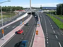 Finnish regional road 100 (Finnish: Seututie 100, Swedish: Regionalväg 100), commonly known as Hakamäentie Swedish: Skogsbackavägen), is a regional road in Helsinki. The road is an important cross-section between the northern districts of the Helsinki peninsula and part of the planned Pasilanväylä.