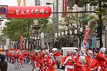 Many people from in and outside of Fukuoka as well as from overseas come to see this enormous festival. This festival has two main parts, the parade and performance. Men and women regardless of age walk through the streets in various costumes, playing various instruments, while others clap with rice scooping spoons (Shamoji). People who join the meeting that is usually held in February can participate in the parade so in the past Mickey Mouse and Snoopy came and joined in the parade.[1] Also, there would be more than 30 stages/performance places in the city.