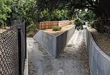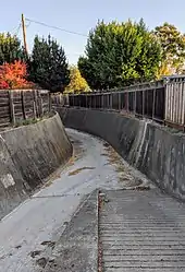 Hale Creek is part of the Santa Clara Valley Water District's (SCVWD) Permanente Creek Flood Protection Project which aims to install overflow basins along Hale and Permanente Creeks to catch one hundred year flood waters in order to protect 1,664 parcels (1,378 homes, 160 businesses and 4 schools/institutions) downstream of El Camino Real (saving potential damages in excess of $47.9 million) and prevent flooding of Middlefield Road and Central Expressway, by 12/30/2016 and also to identify opportunities for environmental enhancement such as stream restoration, as well as trails, parks, and open space.[13] From its confluence with Permanente Creek upstream to Rose/Rosita Avenue, the channel has been set in a straight concrete channel to move storm flows - at Marilyn Drive it is dated 1952 and at Arboleda Drive it is dated 1960. The concrete sides transition smoothly from rectangle to trapezoid just over 30 feet north of Arboleda Drive. However the SCVWD in 2012 proposed widening and/or deepening this concrete channel.[14]