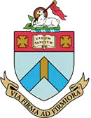 The school badge was designed in 1986 at the request of the Headmaster, John Crook, by his Deputy Head, John Mitchell. The blue chevron represents the Halliford Bend in the River Thames where the School is situated. The origin of the word Halliford as derived from HOLY FORD is represented by the gold bar, or pallet (stripe), at the apex of the chevron. The two gold crosses were copied from the finials of the churchwardens' staves in the parish church of St Nicholas, Shepperton, within which parish the School stands. VADUM SANCTUM inscribed on the open book (for Education) is the Latin for "Holy Ford", and picks up the tradition that Julius Caesar crossed the Thames by way of an ancient ford hereabouts, and that in later Christian times a holy man or hermit lived at the end of Manygate Lane, close by the ancient crossing point. The crest depicts a Holy Lamb couchant, illustrating the close links with Shepperton (Sheep Town). The Motto, VIA FIRMA AD FIRMIORA, translates roughly as A FIRM PATH TO FIRMER THINGS. It represents the School's aim to guide its pupils through the uncertain and turbulent waters of adolescence to the steadier ground of young manhood.