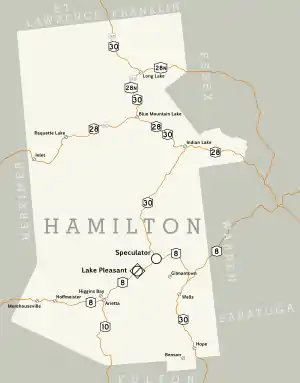 Hamilton County is a county in the U.S. state of New York. As of the 2020 census, the population was 5,107,[2] making it the least populous county in New York. With an area nearly the size of Rhode Island, it is the least densely populated county east of the Mississippi River. Its county seat is Lake Pleasant.[3] The county was created in 1816 and organized in 1847.[4]