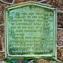Katherine Hamilton, the Countess Dowager of Morton erected a monument, but it was destroyed by the French.[3] The grave was rediscovered in 1908 during expansion of a road.[1]