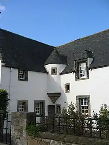 Hamilton House comprises a two-storey main block with projecting wings at either end.[3] The date 1628 (or 1626) appears in a panel above the former main entrance,[5] with the initials IH and KS representing Sir John Hamilton, Lord Magdalen, and Katherine Sympson, while thee three pediments of the dormers have the Hamilton's coat of arms, their impaled initials and the date 1628, as well as the arms of Katherine Sympson.[3] The exterior is harled and whitewashed, has chamfered stone edges and crow-stepped gables,[2] known in Scots as corbie-stepped.[3] The chimney stacks have stripped quoins.[2] The house has a hexagonal stair tower which stands in the corner of the main block with south wing and which contains the main entrance, above which is the inscription "Praised be the Lord My Strenth and My Redeimer",[1] while at the other end of the main block there is a round conical roofed, corbelled-out turret. The house has a steep roof tiled with stones. When the road outside was widened an outbuilding and a passageway were demolished, reducing the size of the courtyard. The adjacent road is also around 500mm higher than the original dirt road, from when the surface was macadamed in the 19th century. The interior of the building has been completely re-ordered in relation to its original form.[3]