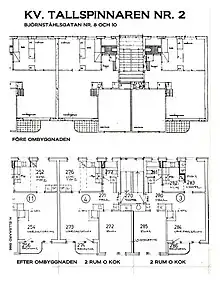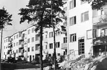 Together with Traneberg, a district west of the historical city centre, Hammarbyhöjden was one of the centrally located, hilly terrains bought by the city of Stockholm in 1917. The terrain made it unsuitable for the kind of garden cities built during the 1910s and 1920s. Furthermore, by the early 1930s the city authorities had realised the successful small-scale projects of the past could not solve the ramping shortage of dwellings the city was experiencing. In both these districts the ideals of Functionalist architecture — multi-family buildings in a natural scenery — were therefore implemented. A plan for the area was adopted in 1930, featuring 15 metres thick buildings 3–4 stories tall. The early 1930s saw few construction projects realized, and when a builder willing to carry the project out finally appeared, he demanded that the plan should be redrawn in accordance to a proposal by Ragnar Östberg — a plan featuring buildings 10 m wide arranged in an unmistakably classicist manner. These negotiations foundered, however, and the city redrew the plans again — now with a programmatically functionalist plan. Construction finally started in 1935, but, due to the stalled negotiations, Hammarbyhöjden lost its pioneering role to Traneberg which had its 1932 city plan quickly realised. Nevertheless, more than 4.000 flats had been built in Hammarbyhöjden by the 1950s, 92 per cent of which were two room-flats with a kitchen or smaller.[4]