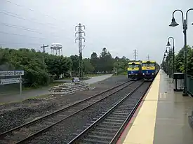 A Montauk-bound train arrives at Hampton Bays Station as it passes an idling train on the next track.