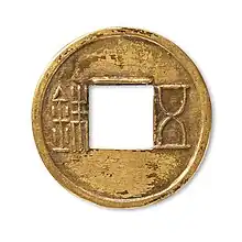During the reign of Emperor Ling, a type of Wu Zhu cash coin known as "corner coins" (角錢) are believed to have been produced in the year 186 AD.[30] Cities in ancient China had city walls built surrounding them as a means of fortification and protection.[30] It is said that the square central hole of these "corner coins" represented the city and that the 4 lines going out of the coin symbolised wealth flowing out, portending the fall of the Eastern Han dynasty in the year 220 AD.[30]