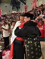 After receiving the gold medal, Hanifan headed to the VIP section where President of Indonesia Joko Widodo and Prabowo Subianto, as the head of Indonesia's Pencak Silat Association, were present. Following a normal handshake with vice president Jusuf Kalla, Hanifan embraced both Widodo and Prabowo in a hug while draped by the Indonesian flag, eliciting cheers from the audience. Widodo and Prabowo were set to compete in the 2019 presidential election, and the hug was seen as a symbol of unity.[12][13] An image of the occasion later posted to Widodo's Instagram account was liked over 1 million times,[14] and the image also became a trending topic on Twitter.[3]