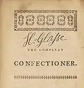 The Art of Cookery Made Plain and Easy consists mainly of English recipes, and is aimed at providing good, affordable food,[41] and the television cook Clarissa Dickson Wright saw the work as "a masterly summary" of English cuisine of well-to-do households in the mid-18th century.[3] Glasse saw that household education for young ladies no longer included confectionery and grand desserts,[42] and many of the recipes in The Compleat Confectioner move away from the banqueting dishes of the 17th century to new style desserts of the 18th and 19th.[43] In The Art of Cookery she shows signs of a modern approach to cooking with more focus on savoury dishes—which had a French influence—rather than the more prestigious but dated sweet dishes that had been favoured in the 17th century.[44] In The Compleat Confectioner she writes: