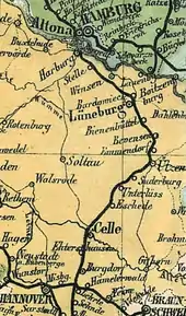 Junctions with other lines were formed including the America Line, the Aller Valley Railway from Gifhorn via Celle and Schwarmstedt to Verden (Aller), the Wendland Railway, the Braunschweig–Uelzen railway, several predecessors of the East Hanoverian Railways as well as the Celle–Brunswick, Lüneburg–Buchholz in der Nordheide, Lübeck–Lüneburg and Uelzen–Dannenberg railways.
