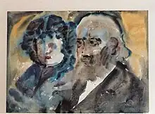 In one of his most cryptic and intriguing works, Affenballade (Ballad of the Apes), he created a grid of bars that are painted along the lines of the Hessian sacks he used as a canvas.[6] In the late 1920s, he began to create, apparently for private amusement, a series of eccentric, caricature-like watercolors that reveal a knowledge of works by such modern figures as Emil Nolde and Alfred Kubin. These often satirical commentaries are unlike any of his other, more formal works, and are described by later critics as revealing both a scurrilous sentiment [7] and a debt to German Expressionism.[8] These sometimes anguished images are the pieces that have endured and are of greatest interest to contemporary audiences, who see in them a psychological reflection of the time between the wars in Vienna.
