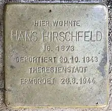 After enforcement of the Nazi edict, Gesetz zur Wiederherstellung des Berufsbeamtentums (1933), Hirschfeld was forced into taking early leave, later losing his teaching licence and his right to practice medicine. In October 1942 he was deported to the Theresienstadt concentration camp, where he died on 26 August 1944.