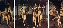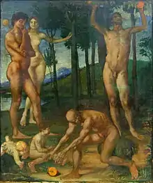 In the 1880s Marées painted four monumental triptychs: The Judgment of Paris, The Hesperides, Three Saints on Horseback and The Wooing.[3] During this time he also produced smaller mythological paintings and some portraits.[6] He spent these last years of his life in Rome, supported by Fiedler.[1] He died there in 1887, at the age of 49, and was buried in the Protestant Cemetery.