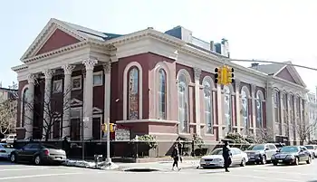 Hanson Place Seventh-day Adventist Church, is an historic church at 88 Hanson Place between South Oxford Street and South Portland Avenue in the Fort Greene neighborhood of Brooklyn, New York City, which was built in 1857-60 as the Hanson Place Baptist Church. It was designed by George Penchard in the Early Romanesque Revival style. The building, which is constructed of brick on a brick foundation covered in stucco, features an entrance portico topped by a steeply pitched pediment supported by four Corinthian columns, while the side facade on South Portland features pilasters. The building's interior and exterior were restored in the 1970s. It has been a Seventh-day Adventist church since 1963.[2][3][4]