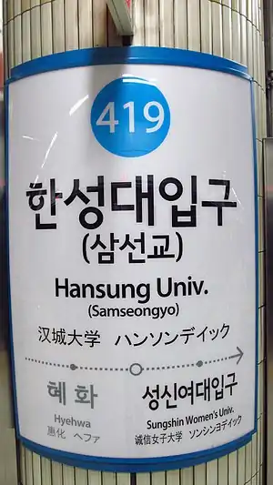 1. 1 2 "Hansung Univ. (Line 4)". Seoul Metro. Archived from the original on March 1, 2017. Retrieved February 28, 2017.