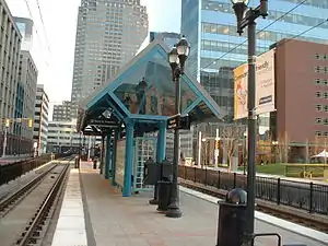 Harborside station (formerly named Harborside Financial Center station) is a station on the Hudson–Bergen Light Rail (HBLR) located east of Greene Street, between Morgan and Steuben Streets, in Exchange Place section of Jersey City, New Jersey and named for the adjacent Harborside office complex. There are two tracks and an island platform.