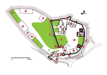 The main castle is surrounded by a wall with six towers, which is one of the oldest buildings. It includes the bailiff's residence (today the restaurant and hotel), the granary, the two keeps, the palace, the hall building, the well, the bakery (today the ticket office and shop) and the chapel. A little further down is the outer bailey with the commercial buildings, including the Red Stabels. It is said to have been sketched by Carl Spitzweg during a visit in 1858.