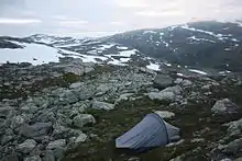 The landscape of the Hardangervidda is characterised by barren, treeless moorland interrupted by numerous pools, lakes, rivers and streams. There are significant differences between the west side, which is dominated by rocky terrain and expanses of bare rock, and the east side, which is much flatter and more heavily vegetated. The climate also varies between the two sides: it is considerably wetter on the west side than on the east, with over 1,000 millimetres (39 in) per year recorded in some parts.[4] The prominent peak of Hårteigen 1,690 m (5,545 ft) is visible across much of the plateau.[5][6]