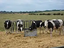 A cow magnet is a veterinary medical device for the treatment or prevention of hardware disease in cattle.[1] Traditionally, cow magnets were strong Alnico magnets about 1 cm by 8 cm (0.4 by 3.1 inches) in the shape of a smoothed rod, but today they are more commonly several ring-shaped ferrite magnets attached to a stainless-steel or plastic core, in the same shape as the single-piece original. Newer designs to help increase effectiveness include a cage design, in which the magnet holds metal objects inside a protective plastic framework. Even newer designs include a stronger array of rare-earth magnets inside a stainless steel body that resembles the original Alnico design.