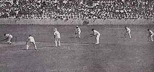 His illness meant that Larwood missed the second Test, at Lord's, which saw Australia score a record 729 for 6 including a rapid 254 from Bradman, at the time the highest individual Test score in England.[56] Australia won the game by seven wickets, to draw level 1–1 in the five-match series. Larwood returned to the England side for the third Test, at Headingley, Leeds. He later claimed that his first ball to Bradman, before the batsman had scored, was a bouncer that touched the edge of the bat and was caught by the wicket-keeper, George Duckworth: "You could hear the snick all over the ground". The umpire, however, gave Bradman not out.[57][n 3] Bradman went on to compile 334, beating his record score of two weeks earlier.[59] Larwood's one wicket in the Australian innings cost 139 runs; England were saved from probable defeat when the game was shortened by rain.[60] The England selectors dropped Larwood from the team for the fourth Test, in which Bradman was limited to 14 runs, but the game was rained off after just over two days' play.[61] Larwood was recalled for the final Test at the Oval that, as in 1926, would determine the series victor. In a game with no time limit, Australia replied to England's 405 with 695 (Bradman 232), then dismissed England for 251 to win by an innings and 39 runs. Larwood's single wicket—Bradman, for the first time in Tests—cost 132 runs. In the three Tests in which he played, Larwood took 4 wickets for 292; Bradman, he admitted, had "pasted me unmercifully".[62] Commentators recognised the danger that Bradman presented to English hopes; the former England bowler Percy Fender, who was captain of Surrey and a respected cricket journalist, was convinced that "something new will have to be introduced to curb Bradman".[63] Warner was explicit: "England must evolve a new type of bowler and develop fresh ideas and strange tactics to curb his almost uncanny skill".[64]