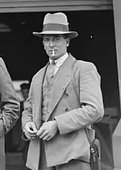 Larwood was first called for full county duty on 20 August 1924,[9] against Northamptonshire, at Trent Bridge. He bowled 26 overs in all, conceded 71 runs and took the wicket of Vallance Jupp, an experienced Test all-rounder.[10] His assessment of his performance was negative: "I wasn't ready". Iremonger was much more positive, assuring Larwood that his bowling required only fine tuning.[11] Larwood had also gained the support of the county captain, Arthur Carr, a powerful personality who decided that the new recruit had the makings of a future Test match bowler. "The best way to deal with him", Carr said later, "was as if he was my own son".[12] Carr played a major part in encouraging and developing the young bowler's talents, and acted as Larwood's guiding spirit throughout the latter's career.[13][n 1]