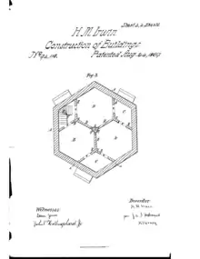 On August 24, 1869, at the age of 41, she received patent number 94,116 for her design of a six-sided house.[13] The patent emphasized more-efficient lighting, better movement of air, and better use of space. Even the rooms in Irwin’s house were six-sided.[14] To promote her patent Irwin wrote the book, The Hermit of Petraea, in 1871, in which she discussed her ideas of health, the outdoors and how hexagonal living could promote physical well-being. That same year, she, her husband and her brother-in-law Daniel Harvey Hill organized the Hill and Irwin Land Agency which specialized in hexagonal homes, at least two houses were built in Charlotte based on Irwin's patent, since demolished.[14] The patent details the design of the house, from its six-sided exterior construction, to the division of the resulting hexagon into three smaller hexagons and several smaller diamond-shaped rooms in the corners to serve as storage, stairwells, or porches, a central chimney stack at the junction of the three main rooms, and a mansard roof.[2] A key feature of the plan was an economical use of building materials by a skilled architect, wherein a larger area could be enclosed with the same length of perimeter material, and she personally thought that a hexagonal building offered more aesthetic opportunities than the rectilinear standard.