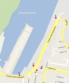 Historical locations of Harry's Cafe de Wheels on Cowper Wharf Road, Woolloomooloo. A:1938–39, 1945–81. B:1981–82. C:1983–84. D:1985–91. E:1991–present day. Note: Map shows current position of Cowper Wharf Road. The 1981–82 location was on the footpath of Cowper Wharf Road before the road was relocated further west in 1982.