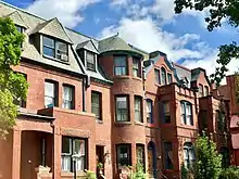 A group of row homes on the 1600 block of Riggs Place NW, in the northeastern section of Dupont Circle, is the only remaining example of the architect's contribution to more modest residential forms in Washington, DC. These 16 homes, on what is known as the Harvey L. Page block, represent a rare well-preserved assemblage of late 19th century residential architecture and workmanship in the Dupont Circle Historic District. The particular historic value of this the block was highlighted when the National Park Service expanded the Dupont Circle Historic District in 1984. In arguing for the expansion, the D.C. Historic Preservation Office described the block as a "beautifully preserved enclave much praised for its original stained glass and brick and copper work."[11] The front facades of the homes at the eastern end of the row have ornate angular roof lines typical of the Queen Anne style. Also notable are the copper-clad bays and Hummelstown stone trim from the Lebanon Valley in Pennsylvania.[2] The eight houses between 1610 and 1618, and 1613 and 1617 were built beginning in April 1889.[2] The five homes at the western end of the row (1634 to 1626) form a distinct unit and were built in 1893.[2] They have essentially similar designs in the less ornate Romanesque revival style, differing from each other only in terms of their front bays which alternate in shape between trapezoid, rectangular and oval. In October 2016, the District of Columbia Historic Preservation Review Board (HRPB) heard a dispute over the development of two row homes on the south side of the Harvey L. Page block. Noting the historic value of both front and rear views of the homes, HPRB decided that rear additions to the homes should be limited to one story. In testimony before the HPRB, architectural historian Eimily Eig stated that: "This group of row houses is one of the most intact groups in Dupont Circle. Designed by a master architect, its composition at both the front and rear walls represents a skilled understanding of proportion." In this context she also noted that "the rear elevation of the row houses presents a high quality of design that should remain visible to the public along 17th street and the much used rear alley, as well as continuing access to a view that has been in place since 1893."