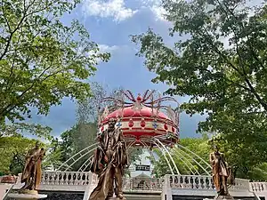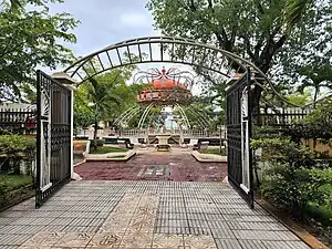 Central park of Hato Mayor. The local Roman Catholic parish can be seen behind the roundabout.