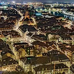 The Hauptstrasse runs right through the Altstadt from Bismarckplatz in the west to the Karlstor in the east, with a slight bend following that of the Neckar river. Between Theaterstrasse and Universitätsplatz, there is a slight rise, which is caused by the alluvial fan of the now subterranean Klingenteichbach stream. The street is around 1.8 km long.[1] It is crossed by numerous streets running from north to south (mostly called Gassen, "alleys") and there are five squares along its route. One of these, the Marktplatz was planned as a market place from the beginning, while the other four - Anatomiegarten, Universitätsplatz, Kornmarkt, Karlsplatz - were created through the demolition of buildings.