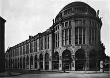 The six-storey building was designed by Franz Heinrich Schwechten, who was also the architect of the Anhalter Bahnhof and the Kaiser Wilhelm Memorial Church. It was constructed between 1911 and 1912 as Haus Potsdam. It was primarily an office building; from 1917 or 1919 until 1927 Universum Film AG or UfA, which owned the site, was headquartered there;[1][2] but the lower floors contained a 1,196-seat cinema, called the Lichtspieltheater im Piccadillyhaus or the Kammerlichtspiele im Haus Potsdam (Cinematograph in the Piccadilly House, Moving Pictures in Haus Potsdam),[3] and the Café Piccadilly.[4] The building was faced with sandstone and gave the impression of masonry, but had a steel frame and the cinema space was spanned by five girders.[5] At the northern end, facing the square, was a circular pavilion topped by a copper dome rising 35 metres above the pavement, with a row of Attic statues beneath it;[6] this was essentially a recreation of the mausoleum of the Ostrogothic king Theodoric the Great in Ravenna.[4] The cafe entrance was on the bottom two floors of this section.[7] Behind it, a long, narrow section in a simplified Wilhelmine architectural style, with a mansard roof, extended some 100 metres alongside the Potsdamer Bahnhof.