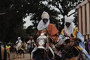 Predominantly Hausa-speaking communities are scattered throughout West Africa and on the traditional Hajj route north and east traversing the Sahara, with an especially large population in and around the town of Agadez.[21] Other Hausa have also moved to large coastal cities in the region such as Lagos, Port Harcourt, Accra, Abidjan, Banjul and Cotonou as well as to parts of North Africa such as Libya over the course of the last 500 years. The Hausa traditionally live in small villages as well as in precolonial towns and cities where they grow crops, raise livestock including cattle as well as engage in trade, both local and long distance across Africa. They speak the Hausa language, an Afro-Asiatic language of the Chadic group. The Hausa aristocracy had historically developed an equestrian based culture.[22] Still a status symbol of the traditional nobility in Hausa society, the horse still features in the Eid day celebrations, known as Ranar Sallah (in English: the Day of the Prayer).[23] Daura is the cultural center of the Hausa people. The town predates all the other major Hausa towns in tradition and culture.[24]