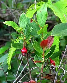 Within the group, distinct taxa vary in berry color (red, yellow, black, blue), bloom color (white, red, pink and green), foliage shape and size, and pedicel length.[5][4] Vaccinium reticulatum and Vaccinium dentatum are evergreen, while Vaccinium calycinum is deciduous.[1][5] All three species tend to fruit and flower throughout the year, but maximum flower and fruit production generally occurs during May - July.[5] Outcrossing between all three species has been successful, and many hybrids have been described. All three species are also capable of selfing, but resulting seed viability differs throughout the species complex.[5]