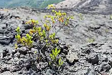 This group is thought to be derived from within section Myrtillus of Vaccinium proper, and is thought to have a North American origin of dispersal. However, confidence in the existing molecular evidence for this hypothesis is low, and therefore the status of the sister group to the Hawaiian clade is still unknown.[3] Hawaii is known as a historical hotspot for adaptive radiation because of immense biological opportunity over small, isolated areas, especially advantageous for plants that colonized the islands when they were first formed by volcanic activity.[6][7] Endemic Hawaiian plant lineages that have undergone adaptive radiation exhibit patterns associated with a loss of dispersal capacity: small populations, isolated usually to one island, if not one small area of one island, exhibiting "explosive" diversity in a small space, reflecting probable "rapid speciation" or an accelerated rate of evolution.[1] However, there is much debate and controversy surrounding the definition and characterization of adaptive radiation.[7]