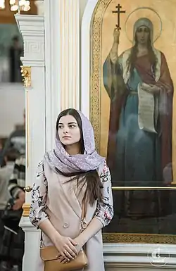 An Eastern Orthodox Christian woman wearing a headcovering at church; behind her is an icon of the early Christian virgin martyr Saint Tatiana of Rome, who is depicted with her head covered.