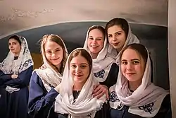 Assyrian Christian women wearing headcoverings and modest clothing praying in Mart Maryam Church in Urmia, Iran.