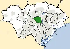 The Heath ward boundaries are coterminous with the community. It is bordered to the north by Ty-wern Road (Rhiwbina ward) and the Cardiff City Line (Llanishen ward), to the east by the Cardiff to Caerphilly railway line (Cyncoed ward), to the south by the Western by-pass (Gabalfa ward) and to the west by the A470 road (Whitchurch & Tongwynlais ward).[1] The Heath ward includes the University Hospital of Wales and the large adjacent area of greenery, Heath Park.