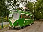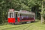 This car is a replica of a Blackpool and Fleetwood Vanguard tram built in 1987. It was built using Blackpool Railcoach 282, built in 1935 and renumbered 619 in 1968. It operated in Blackpool until 2008, and came to Heaton Park in 2010. It operated until 2017 when it was withdrawn for overhaul, Returning to service in December 2022.[14]