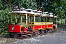 Manchester Corporation Tramways 765 Operational 1914 This car was built in 1914 and is the only remaining electric tramcar from Manchester in regular operation. It was one of a series of unusual single-deck bogie cars of the combination car type, with a central saloon and open smoking compartments at the ends, built for routes with low bridges. The conversion of these routes to buses in 1930 led to most of these cars being sold, and the body of 765 was acquired by a farm near Huddersfield. In 1960 it passed to a group that was to become the Manchester Tramway Museum Society and restoration work started. It has operated at Heaton Park since 1979.[10][11][12]