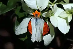 In the males the upperside is creamy white. Forewing: the costa narrowly, the apex and terminal margin to middle of interspace 1 are black. An irregular, somewhat sinuous, black band extends obliquely from beyond the middle of the costa across the upper apex of the cell, and meets at interspace 1 the black on the terminal margin. Within the triangle thus formed is enclosed a rich orange-red patch that is traversed by the black veins and bears in interspaces 3 to 6 a postdiscal series of black inwardly elongated spots. Hindwing: nearly uniform, touched with black on the terminal margin anteriorly and with a conspicuous postdiscal black spot in interspace 7. In some specimens there are one or two smaller spots in continuation of the series in the interspaces below.[3]