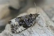 The wingspan is 15–19 mm.The forewings are white, sometimes partly ochreous-tinged, more or less strigulated posteriorly with dark fuscous. The basal patch, central fascia, and included space are dark brown mixed with dark ashy-fuscous and blackish, somewhat whitish-sprinkled, especially in the space on costa and fold.The posterior edge of the fascia has an angular prominence in middle, sometimes followed by one or two dark dots. There isa greyish subterminal streak and the extreme apex is blackish-fuscous. The hindwings are grey, darker in the female . The larva is bright green ; tubercular spots, head, and plate of 2 black.[1]
