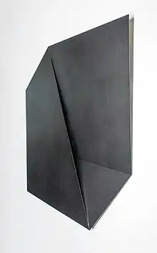 Heiner Thiel works with a variety of sculptural materials. In the 1970s he was fascinated by bronze casting, but in the 1980s he began to experiment with steel sheets, which he pretreated in a complex painting process.[2] He then formed these steel sheets into abstract wall reliefs. Depending on the angle of view, one seems to see a different object, parts of the relief appear in the foreground or disappear, bring out the illusions of perception and thus invite reflection on the theme of perspective.