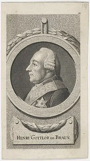 Heinrich Gottlob von Braun (25 October 1717 (or 1714) in Giersleben – 24 December 1798 in Berlin) was a Prussian general of infantry. He served Frederick the Great during the War of Austrian Succession (First and Second Silesian wars), and received the Order Pour le Mérite and the Black Eagle Order. In 1851, he was also memorialized on the Equestrian statue of Frederick the Great.