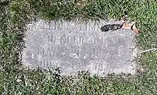 The Richmond Times-Dispatch described Henderson's opposition as coming "from some independent Democrats, Republicans, and wets", the latter referring to opponents of Prohibition.[3] Of her role in Richmond, Henderson said: "I'm not in the Legislature for publicity. It's simply a question of public service with me, and a duty I owe to the people back in those counties which have elected me."[3] While in the General Assembly Henderson gained a reputation as an advocate for the interests of southwest Virginia, calling for more funding for roads and schools. She was the first woman to preside over the Assembly, and sat on four Committees: Roads and Internal Navigation; Counties, Cities, and Towns; Moral and Social Welfare; and Executive Expenditures.[3] Her health, however, had begun to fail in the spring of 1925, and she returned to her parents' home in Jefferson City; she died there in July, without the chance to run for reelection, although she had been unanimously renominated.[1] At her death governor E. Lee Trinkle praised her "many virtues, clear vision and noble aspirations", and ordered flags at the capitol building to be flown at half-staff in her honor.[3] Henderson is buried at Westview Cemetery in Jefferson City.[6]